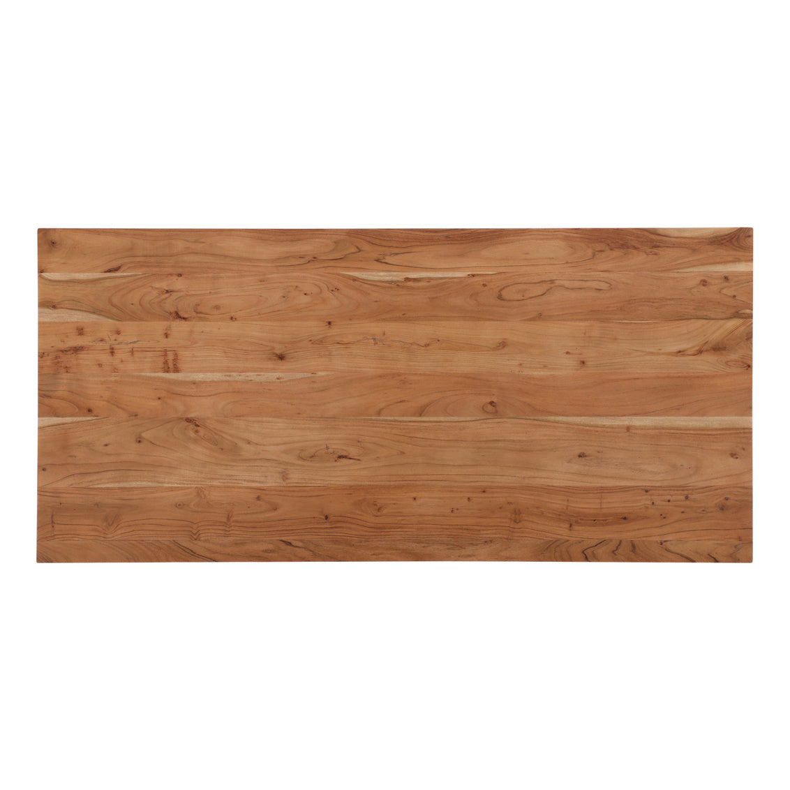 The Sherlock Dining Table features acacia wood with a light natural finish that highlights its rich texture. Its intricate base design adds a sophisticated and artistic flair, making it a striking centerpiece for any dining room.