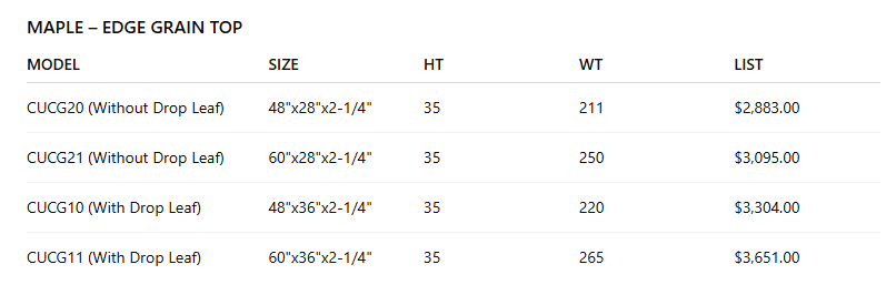 -Top: 2-1/4" thick Northern Hard Rock Maple edge-grain top