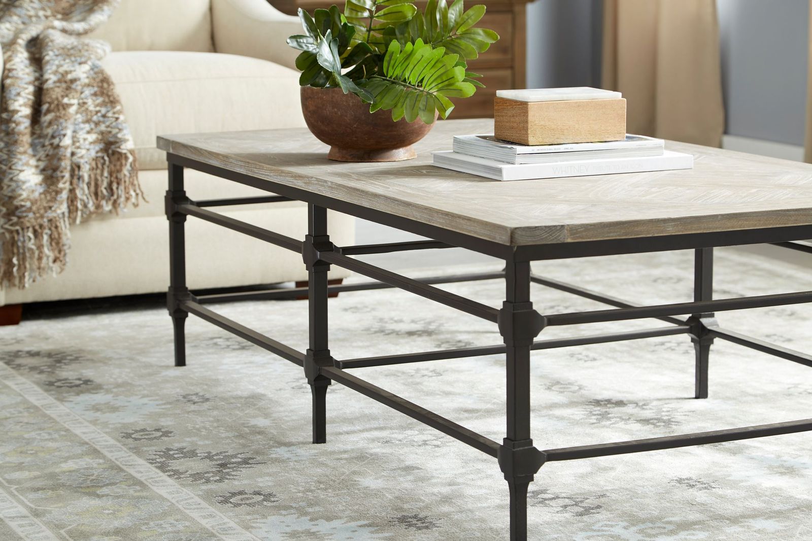 Diagonally aligned parquet panels provide an eye-catching accent to the simple iron base of this streamlined oak and iron cocktail table.