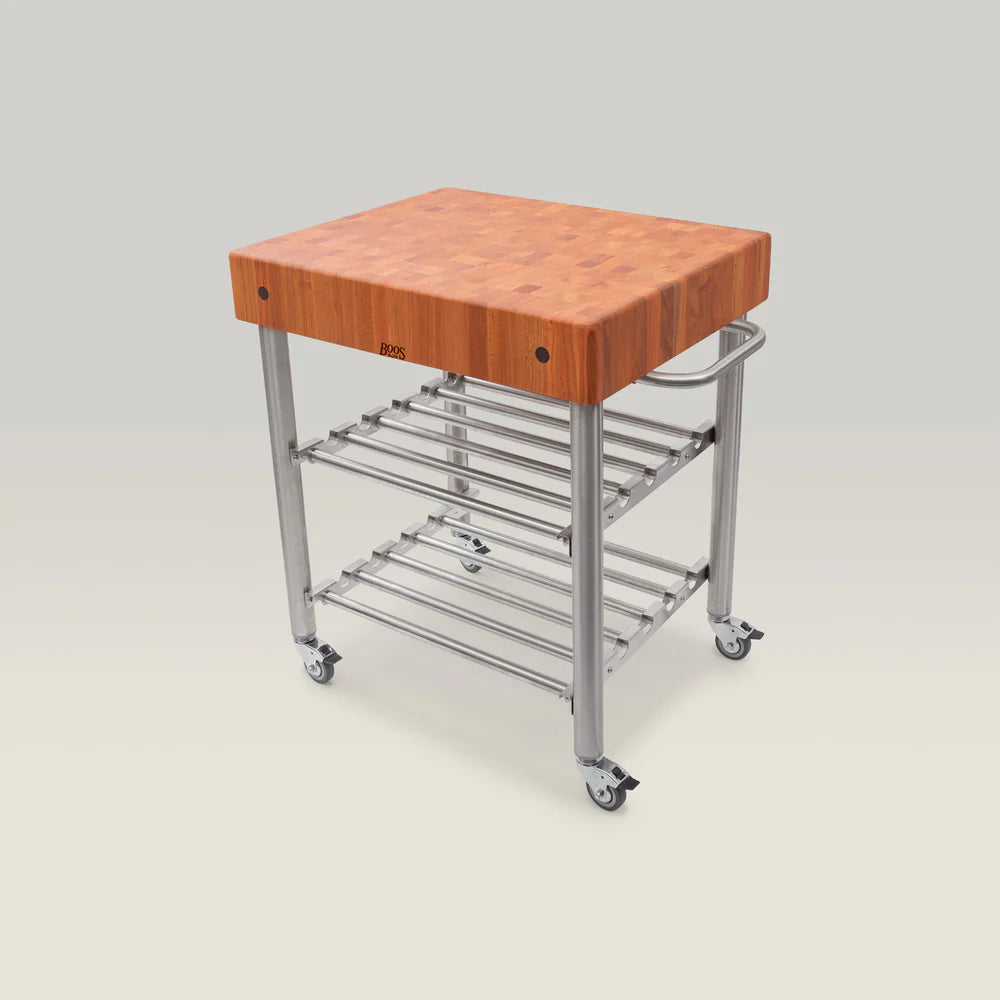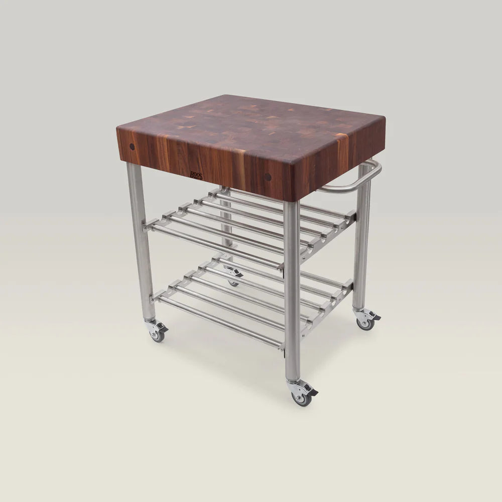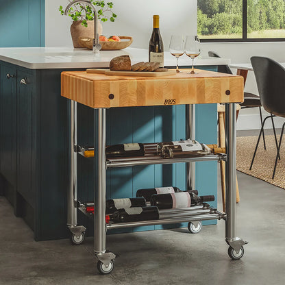 Bring functionality and style to your kitchen with the John Boos Cucina D’Amico Wine Cart, featuring a 5-inch thick end-grain butcher block top made of walnut, maple, or cherry. Designed for both beauty and practicality, this island includes a stainless-steel base, wine racks, a towel bar/handle, and a built-in electrical power outlet strip, making it the perfect addition for any home chef or entertainer.