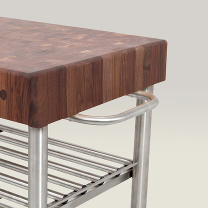 - 5-Inch Thick End-Grain Butcher Block Top: Available in walnut, maple, or cherry, each top is crafted from premium end-grain wood known for its durability and resistance to knife marks. The 1/2” radius rounded edges add a refined touch.