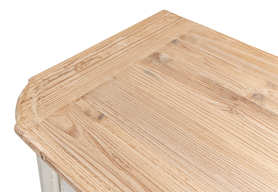 This wonderful sideboard is made of reclaimed pine. The interior shelves are removable. We show a nice combination of a painted base and a natural pine top. Four doors.