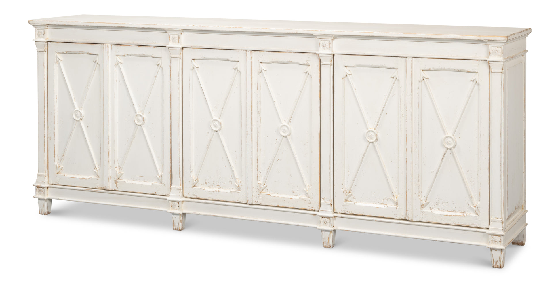 Designed for versatility, the sideboard's interior shelves accommodate a variety of storage needs—from serving pieces and table linens to everyday essentials. The finish adds subtle character while maintaining a refined and classic appearance.